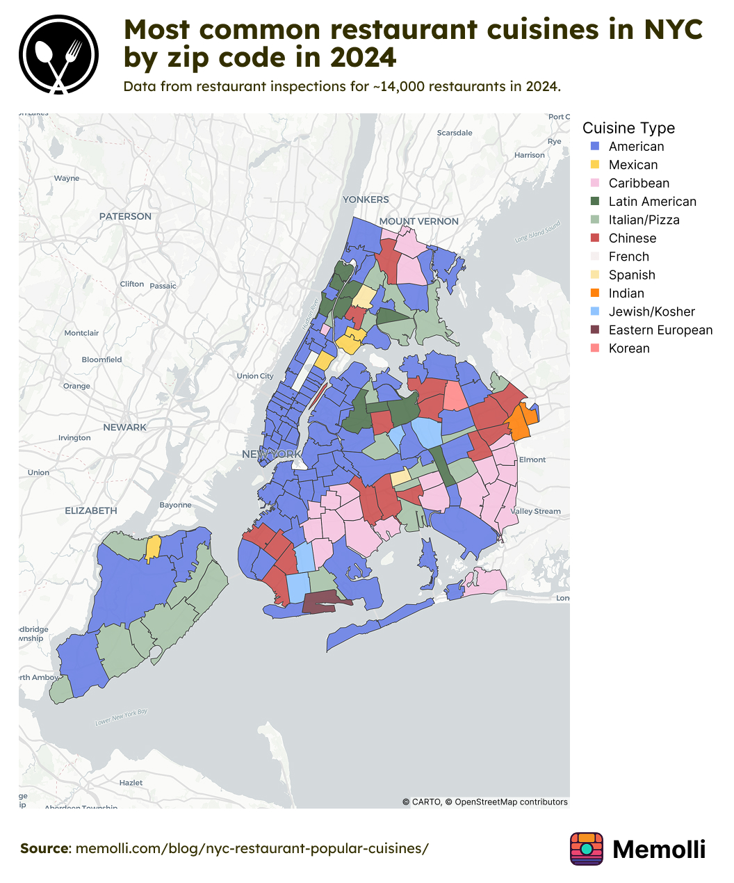 The image below is an interactive version of the map. Hover over a zip code to see the top cuisine type and the number of restaurants offering that cuisine.