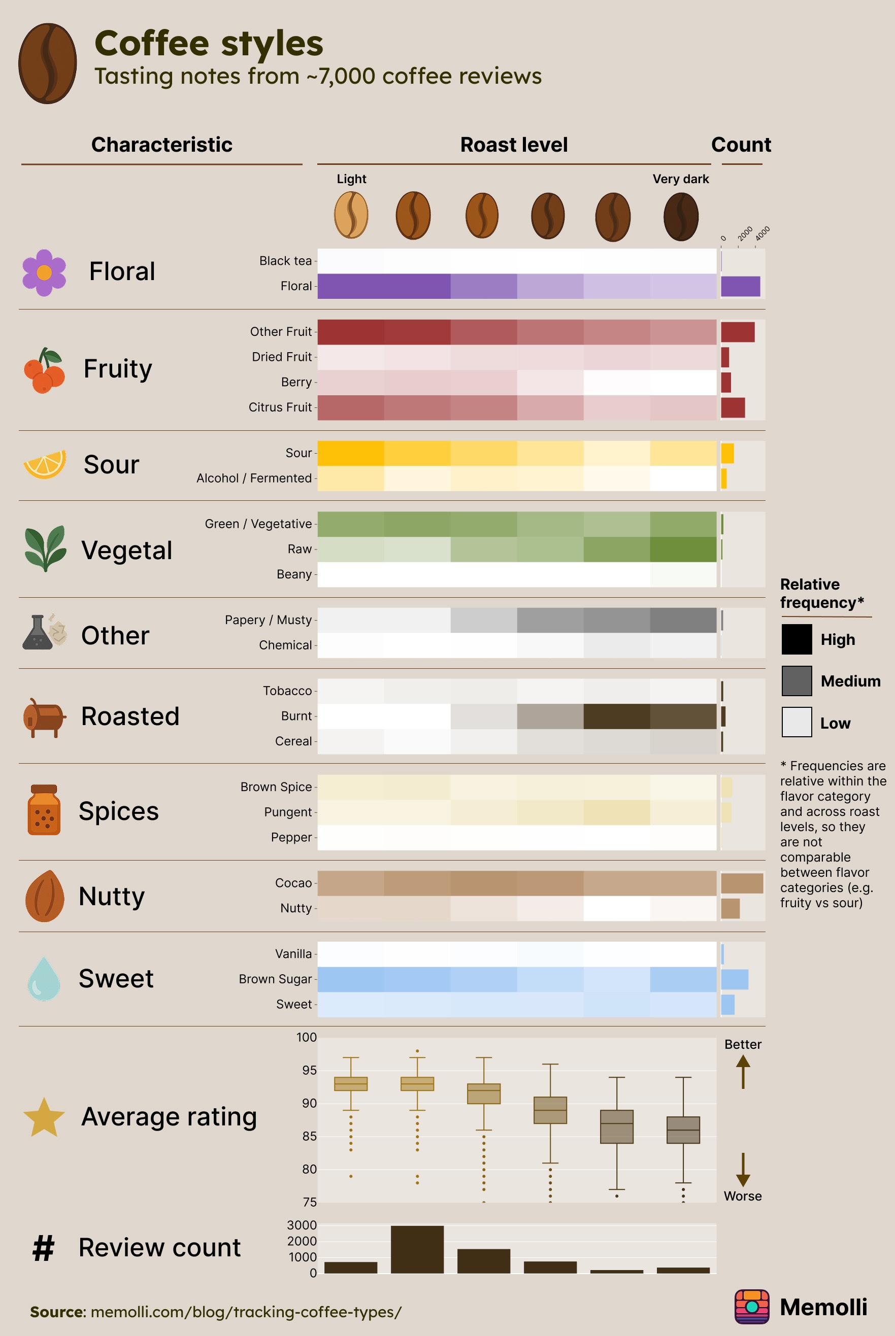 Coffee is a beverage with a rich history and an incredible diversity of styles. Recently, I analyzed a dataset of over 7,000 coffee reviews to visualize how different roast levels compare in terms of tasting notes. The data source and Jupyter notebook are linked at the bottom of this post.